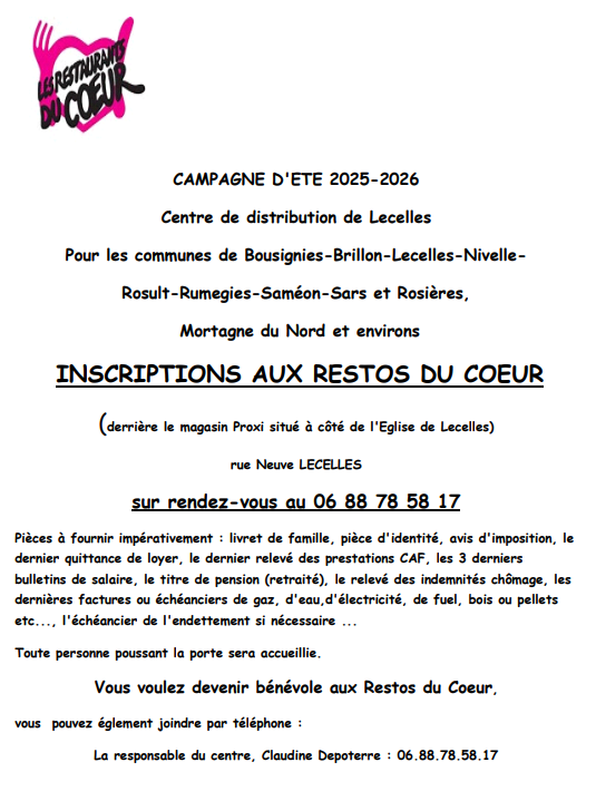 INSCRIPTIONS AUX RESTOS DU COEUR CAMPAGNE D’ÉTÉ 2025-2026 Publication publiée :28 octobre 2025 Post category:Actualités Associatives / Événements Hors Commune Temps de lecture :0 mins read Vous devriez également aimer DEMI FINALE DE LA COUPE DU MONDE 14 décembre 2022 BALADE SANTÉ LE 23/07/2025 DE 14H À 16H À LA BASE DE LOISIRS DE RAISMES 4 juillet 2025 SUPERCAMBROUSSE DANS LA VALLÉE DE LA SCARPE 20 octobre 2022