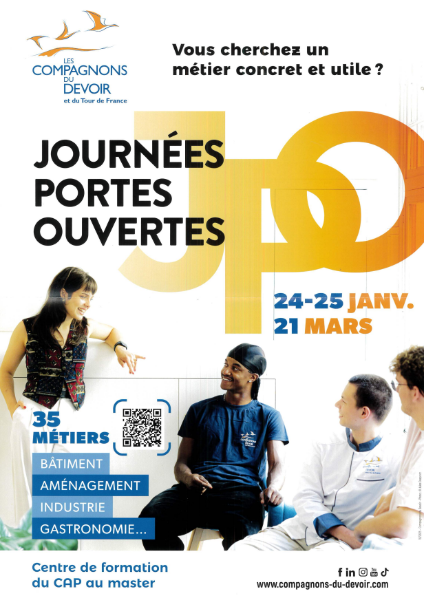 Venez rencontrer les Compagnons du Devoir pour découvrir leur modèle de formation en alternance et trouvez votre voie parmi une trentaine de métiers concrets et utiles lors de leur journée portes ouvertes le 24 & 25 janvier & 21 mars.